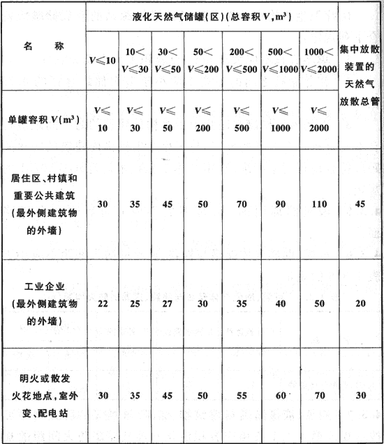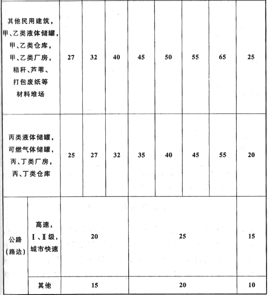 注:居住區(qū)、村鎮(zhèn)指1000人或300戶及以上者;當(dāng)少于1000人或300戶時,相應(yīng)防火間距應(yīng)按本表有關(guān)其他民用建筑的要求確定。