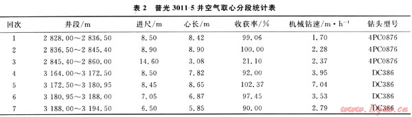 空氣鉆井取心與常規(guī)鉆井液鉆井取心不同,它是直接用大氣中的空氣作為循環(huán)介質(zhì)來(lái)冷卻鉆頭和攜帶巖屑,滿足鉆井取心需要的一種特殊取心方法。相比較常規(guī)取心,在取心配套工具、取心鉆井參數(shù)存在諸多難題:①取心工具因?yàn)闆](méi)有鉆井液的潤(rùn)滑,導(dǎo)致懸掛軸承易失效,工具易磨損;②巖心爪長(zhǎng)期與巖心摩擦形成高溫,不利于降溫,提前造成巖心爪損壞,割心難以保證成功;③空氣取心具有空氣鉆井的優(yōu)點(diǎn),鉆時(shí)很快,但對(duì)割心位置的巖性難以判斷。在普光氣田進(jìn)行了兩口井的空氣鉆井取心試驗(yàn),使用川7-5取心工具,機(jī)械鉆速為3.24m/h,而常規(guī)鉆井液取心機(jī)械鉆速只有0.5m/h。鉆具組合為Φ241.3mm(或Φ215.9mm)PDC+川7-5取心工具+Φ158mmDCX 3根+Φ127mmHWDP×15根+Φ127mmDP。空氣鉆取心技術(shù)參數(shù):鉆壓為20~30kN;轉(zhuǎn)速為35r/min;排氣量為120~130m3/min;立管壓力為2.2~2.4MPa(表2)。