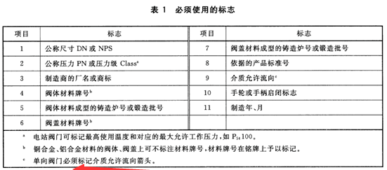 公稱尺寸不小于DN32的閥門必須使用的標志見表1。
