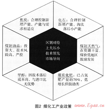 根據(jù)煤化工終端產(chǎn)品的不同,其重要性及配套政策也各不相同的。比如焦炭、電石及甲醇,因?yàn)樗鼈兌贾皇浅跫壍拿夯ぎa(chǎn)品,技術(shù)要求不高,產(chǎn)能已經(jīng)嚴(yán)重過剩,因此,合理控制新增產(chǎn)能,淘汰落后工藝就顯得尤為重要;而對于煤制氣,國家就采用了鼓勵政策,要求在資源豐富、煤價(jià)低的地區(qū)鼓勵發(fā)展;對于煤制油,因?yàn)槠渫顿Y需求巨大,技術(shù)風(fēng)險(xiǎn)相對較高,國家采取了嚴(yán)格監(jiān)管摸索前進(jìn)的方針(圖2)。