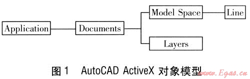 Documents對象下面有Model Space(模型空間)及Layers(圖層)等一系列對象集合。Model Space是圖形文件中的圖形實體集合,如Line(直線),每個實體均可通過相應對象的屬性進行操作,改變或得到相應的參數(shù),如直線坐標。Layers是圖層集合,通過對Layers對象的引用可以得到圖層集合的子對象,如Layer。