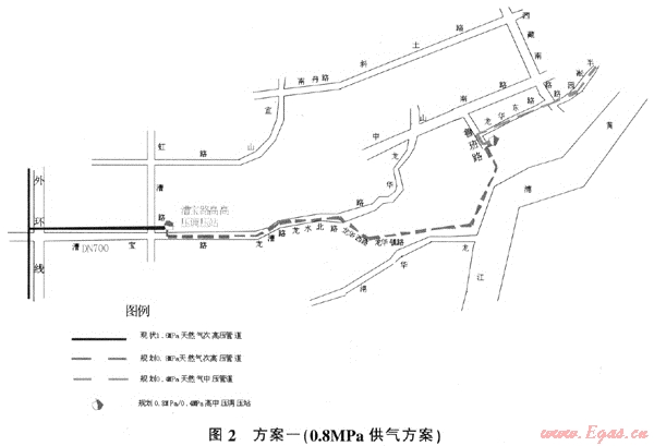 經(jīng)過與市規(guī)劃部門的征詢,認(rèn)為該方案中初步確定的高壓站站址(龍華東路、魯班路口)無法實(shí)施,由于沒有管位,0.8MPa次高壓管道無法敷設(shè)到魯班路。