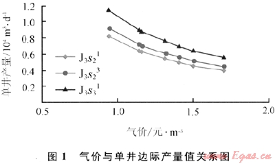 根據(jù)上面研究計算的Ⅰ號氣田3個不同埋深氣藏J3s21(2300m)、J3s23(2450m)、J3s31(2600m)氣價與單井邊際產(chǎn)量值的關(guān)系,通過歸納分析,可知隨著氣價上漲單井產(chǎn)量界限值呈冪指數(shù)遞減,當氣價小于1.5元/m3時單井產(chǎn)量界限值遞減較快;當氣價大于等于1.5元/m3時趨于平穩(wěn)(見圖1),說明氣價對難動用儲量的動用影響較大。
