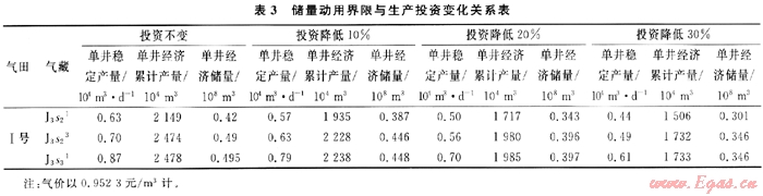 儲量動用的技術(shù)界限值(邊際值)不但與油氣價敏感,而且與投資成本也密切相關(guān)。在一定的范同內(nèi)適當降低生產(chǎn)投資費用,利于難動用儲量開發(fā)經(jīng)濟效益的提高。表3為研究選用的Ⅰ號氣田儲量動用界限與生產(chǎn)投資變化關(guān)系表,由表3可算出投資降低20%時,儲量動用邊際值降低20%~22%。而當氣價由0.9523元/m3上浮至1.143元/m3(也上浮20%時),儲量動用邊際值降低16%~17%,相比之下儲量動用的技術(shù)界限值與投資成本更敏感。因此,在分析難動用儲量的可動用性時是應(yīng)該油氣價格和投資兩方面的經(jīng)濟因素都要考慮。