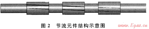 基于井下安全的考慮,這里選擇被廣泛應(yīng)用于鉆井現(xiàn)場(chǎng)的井下穩(wěn)定器作為節(jié)流元件的參考結(jié)構(gòu)。在產(chǎn)生需要壓差的前提下,為了保證鉆井液(包括巖屑)能夠沿流道順利通過(guò)節(jié)流元件而不發(fā)生阻塞,這里使用多級(jí)節(jié)流的方法來(lái)達(dá)到預(yù)期的節(jié)流效果,如圖2所示。