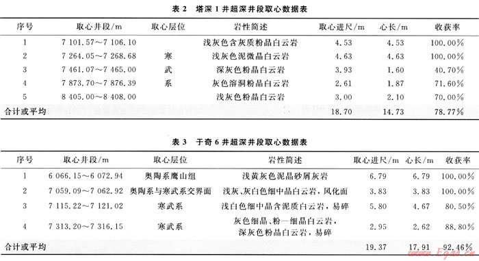 于奇6井是中國石化西北油田分公司在阿克庫勒凸起北東斜坡帶布置的一口重點超深探井,位于新疆輪臺縣境內,地處沙漠邊緣但靠近天山,完鉆井深7510m,目的層是中-下奧陶統(tǒng)鷹山組、蓬萊壩組和寒武系。本井在超深井段取心4次,使用250P取心工具,取心情況如表3所示。