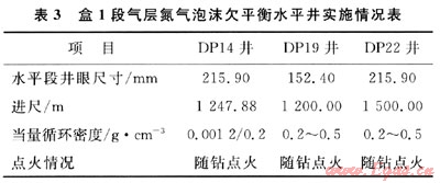 2009年先后針對(duì)大牛地氣田的盒1段氣層在DP14井、DP19井和DP22井開(kāi)展了氮?dú)馀菽菲胶忏@水平井的現(xiàn)場(chǎng)試驗(yàn),在儲(chǔ)層保護(hù)、油氣發(fā)現(xiàn)、自然建產(chǎn)和提高鉆井速度方面取得了顯著效果,表3給出了盒1段氣層氮?dú)馀菽菲胶馑骄畬?shí)施情況。