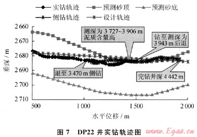 DP22井在水平段的氮?dú)馀菽菲胶忏@進(jìn)過(guò)程當(dāng)中實(shí)現(xiàn)了隨鉆點(diǎn)火,火焰高4~6m,后效火焰高9~11m,油氣顯示非?;钴S。DP22井在井深3727~3906m井段伽馬值偏高,判斷為鉆遇泥巖夾層,后退至3470m處進(jìn)行懸空下切側(cè)鉆,后鉆至井深4442m處完鉆,由于后退下切側(cè)鉆導(dǎo)致氮?dú)馀菽瓕?shí)鉆進(jìn)尺超過(guò)1900m。在最后一趟鉆起鉆過(guò)程中出現(xiàn)了卡鉆事故。事故原因?yàn)槌辽晨ㄣ@,最后一趟鉆總進(jìn)尺為281.54m,平均機(jī)械鉆速為11.04m/h,在鉆井過(guò)程中伽馬值偏高,同時(shí)出口處沒(méi)有巖屑返出。圖7給出了DP22井氮?dú)馀菽菲胶馑蕉螌?shí)鉆軌跡。