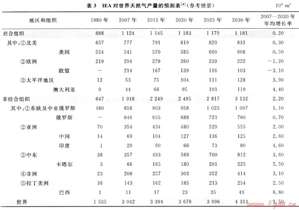 對天然氣已探明儲量的認識大家比較一致,對于已知氣田的儲量增長量、待發(fā)現天然氣的常規(guī)資源量和非常規(guī)資源量有許多機構和學者做過預測。在此基礎上國際能源署(IEA)在2008年對世界天然氣產量進行了預測(表3)。
