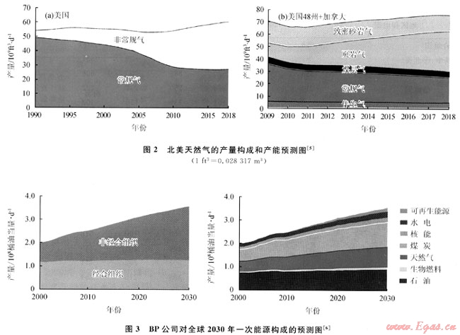表4表明,2009年美國的天然氣儲量為6.93×1012m3,而俄羅斯為44.38×1012m3,美國的儲量僅為俄羅斯的15.6%。如果從儲量和產量的相關性而言,很難理解美國的產量超過俄羅斯這個事實。其根本原因是,由于非常規(guī)天然氣的特殊性,雖已有很高產量,但仍未計入儲量數據統計。2009年美國的非常規(guī)天然氣的產量幾乎與常規(guī)氣相當。根據劍橋能源的預測[5],未來的美國和整個北美(包括加拿大)的非常規(guī)天然氣產量將超過常規(guī)氣,其中頁巖氣將起到重要作用(圖2)。