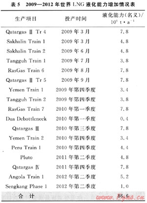 5) 中東在建的LNG項目在未來幾年還將投入生產。澳大利亞煤層氣液化的LNG將有大的發(fā)展,正建或待建的項目共有8個,產能超過5000×104t/a。據IHS(Information Handling Service)公司的資料,2009—2012年新增的LNG產能將達到8660×104t/a(表5)。