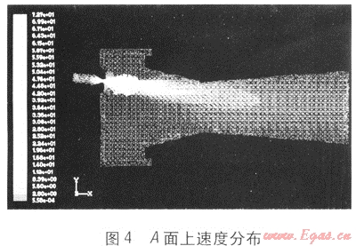 圖4為引射器A面上速度分布。燃?xì)庖砸欢ㄋ俣冗M(jìn)入引射管,燃?xì)饪勘旧淼哪芰课胍淮慰諝?,?jīng)過喉部后,在擴(kuò)壓管內(nèi)燃?xì)馀c空氣進(jìn)行能量、動量交換,混合趨于均勻,速度趨于穩(wěn)定,兩者混合均勻后經(jīng)擴(kuò)壓管流出。