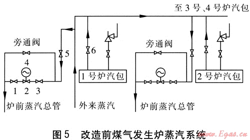 外來蒸汽的壓力一般在0.8MPa左右,經(jīng)過減壓閥減壓后最低保持在0.15MPa左右。煤氣發(fā)生爐自產(chǎn)蒸汽的壓力一般在0.045MPa左右,設(shè)計壓力不超過0.075MPa,經(jīng)過汽包匯集后與減壓后的外供蒸汽一起進(jìn)入爐前蒸汽總管。改造前煤氣發(fā)生爐蒸汽系統(tǒng)見圖5。由于兩者壓力之差,導(dǎo)致外供蒸汽流入煤氣發(fā)生爐汽包,造成煤氣發(fā)生爐的自產(chǎn)蒸汽無法進(jìn)入爐前蒸汽總管,汽包安全閥長年處于開啟放散狀態(tài),從而使大量的蒸汽浪費,存在汽包壓力持續(xù)超過設(shè)計要求的不安全因素。