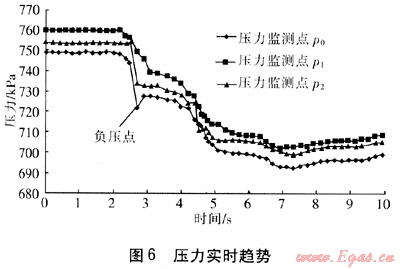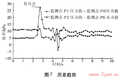 圖6為SCADA系統(tǒng)提供的壓力實時趨勢,P0是距離泄漏點最近的壓力測點,P2次之,P1最遠(yuǎn)。由于負(fù)壓波傳輸需要一定的時間,P0具有明顯的負(fù)壓點,P1和P2的負(fù)壓點不太明顯。圖7為壓差趨勢,通過壓差比對判定壓差波動最大的時刻發(fā)生泄漏,泄漏位置在P0附近。在試驗過程中,城市燃?xì)夤芫W(wǎng)泄漏在線檢測軟件同步運行,得出的結(jié)果與試驗實測結(jié)果對比,即可判定出軟件的準(zhǔn)確度。