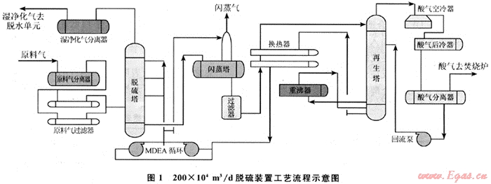 中國石油長慶油田公司所轄靖邊氣田在開發(fā)建設(shè)初期天然氣中的H2S含量平均為500mg/m3,CO2體積分數(shù)平均為3.025%,因此,1997年建設(shè)的長慶第一天然氣凈化廠(以下簡稱一廠)有5套并聯(lián)運行的MDEA溶液脫硫裝置,單套裝置處理能力為200×104m3/d,其工藝流程如圖1所示。