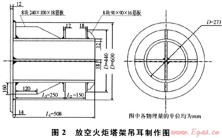 經(jīng)過核算,放空火炬塔架上、下段吊耳均選擇兩個管軸式吊耳,管軸采用Ø273mm×12mm無縫鋼管,材質Q345B,其余材質Q235B,吊耳懸臂長度400mm,吊耳制作如圖2所示。