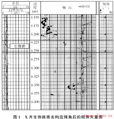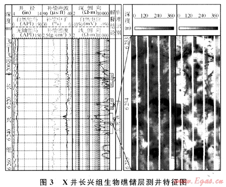生物礁的高能環(huán)境決定了不論礁體是否白云石化或白云化程度如何,礁相自然伽馬幅度值比正常的長(zhǎng)興組石灰?guī)r值低,通常小于15API,一般在9~12API之間,且無(wú)鈾自然伽馬值也低于周?chē)鷰r石,同時(shí)具有較高的電阻率值,補(bǔ)償中子和補(bǔ)償聲波值與致密石灰?guī)r一致。由于成層性差、無(wú)層理和高電阻率,地層傾角為雜亂模式或無(wú)矢量點(diǎn)的空白模式;成像測(cè)井的靜態(tài)和動(dòng)態(tài)圖顯示顏色較為均一致密塊狀特征。礁灘相自然伽馬值略高,識(shí)別相對(duì)困難,易發(fā)育儲(chǔ)層,可根據(jù)與礁核的關(guān)系和成像測(cè)井的巖石結(jié)構(gòu)特征加以識(shí)別。測(cè)井解釋X井生物礁厚度約36m。