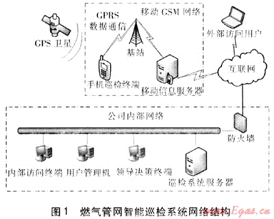安全是企業(yè)發(fā)展永恒的話題[1~3]。如何有效地利用巡檢數(shù)據(jù)信息,消除巡檢工作過程中的安全隱患,有效提高巡檢工作質量,是困擾燃氣行業(yè)巡檢部門多年的問題。燃氣行業(yè)在這個問題上進行了多方面的嘗試,例如采用條碼、IC卡、信息鈕巡更等手段,但是實際效果并不理想。主要原因是這些方法需要在現(xiàn)有的管道和設備上安裝新的巡檢設備,不僅安裝工作量巨大、成本高昂,而且由于巡檢設備多安裝在室外,受風吹雨淋、強電磁場干擾、人為損毀等因素的影響,設備上安裝的條碼、IC卡和信息鈕等信息設備損壞嚴重,增大了巡檢工作的工作量,增加了管理成本,巡檢設備信息的不完整嚴重影響了巡檢效果。智能巡檢系統(tǒng)的出現(xiàn),徹底解決了巡檢工作中出現(xiàn)的上述問題。智能巡檢系統(tǒng)采用無線網(wǎng)絡和GIS技術,不需要在巡檢設備和管道上安裝任何設備,大大降低了系統(tǒng)的采購和維護成本,有效地保證了巡檢人員巡檢質量,可及時消除安全隱患,實現(xiàn)管網(wǎng)巡檢工作的信息化管理。北京市燃氣集團有限公司在這方面已作了不少嘗試[4、5],鞍山市燃氣總公司也在這方面進行了初步探索。
