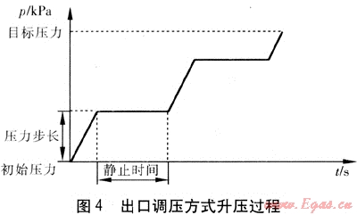 采用調(diào)壓器出口調(diào)壓方式進行調(diào)壓時,需設(shè)置的狀態(tài)參數(shù)包括壓力步長、靜止時間、目標壓力。壓力步長是連續(xù)動作的壓力變化值。靜止時間是每個壓力步長動作完成后至下一步長開始的停頓時間。目標壓力是需升壓或降壓后達到的壓力。控制器按設(shè)定的壓力步長、靜止時間運行,出口壓力傳感器將出口壓力p的信號反饋到控制器,當p等于目標壓力時,升壓或降壓停止。圖4為采用出口調(diào)壓方式進行升壓的過程。