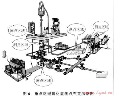 將現(xiàn)場重要區(qū)域,井口、振動篩、除氣器、緩沖罐、泥漿池等位置點布上高靈敏度的硫化氫氣體傳感器[8],喇叭口和泥漿池泥漿里布置硫離子傳感器(圖6)。