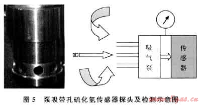 研究認為,最好選擇膜片四周都有透氣膜或透氣孔的傳感器,這樣即使在無風的情況下周邊的硫化氫也容易進入測量探頭,有風的時候效果更好。這種多向測量的改進,很好地保證了測量的及時性,傳感器內部再加上泵吸,效果則更為理想。圖5所示的是目前國內廠家生產的一款四周帶孔的泵吸式硫化氫檢測傳感器。