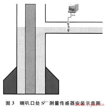 主要存在H2S、HS-、S2-3種形式。鉆井液pH值升高,S2占的比例就相應變大,同時如果硫化氫跟強堿相比量很少,主要形成的也是S2-形式,因此初次進入井筒的硫化氫主要形成的是S2-形式。在普光氣田鉆井液的pH值一般介于9.5~10.5,故可以通過測量喇叭口處泥漿里的含S2-的情況,結合大氣環(huán)境的硫化氫監(jiān)測值,對井場硫化氫情況進確定,尤其對剛剛進入井筒的硫化氫,這種測量克服了目前井場只測大氣中硫化氫的缺點。目前國內已有成熟的S2-在線實時監(jiān)測傳感器(圖3)。
