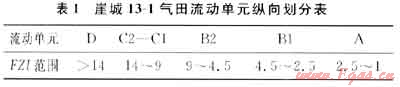 以巖心分析的孔隙度和滲透率數(shù)據(jù)以及測井?dāng)?shù)據(jù)為基礎(chǔ),按FZI法計算各井點的FZI值,并參考地層測壓、測試資料等,分出6個流動單元(表1)。