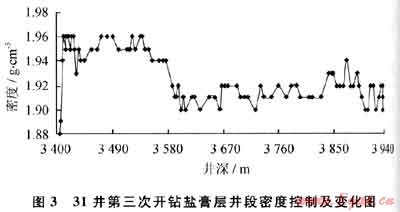 圖3所示為2010年3月31井在第三次開鉆鹽膏層井段(3400~3937m)的密度控制情況。31井第三次開鉆鹽膏層井段初鉆時密度控制在1.95g/cm3左右,進入井深3580m后根據(jù)實際情況逐步降低了鉆井液密度,合理、適當?shù)恼{(diào)整密度范圍以達到“近平衡鉆井”,不僅給鉆井液日常維護帶來了便利,而且明顯提高了鉆井速度、縮短了鉆井周期(第三次開鉆鹽膏層用時僅30d),很好地實現(xiàn)了快速、安全、高效的鉆井目標。