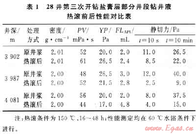28井在第三次開鉆鹽膏層期間除采用高濃度(5%~8%)SMP和SMC三磺材料膠液外,性能維護時還不斷補充FT-1A、PAC等護膠劑進入體系。表1為28井第三次開鉆鹽膏層部分井段鉆井液在150℃熱滾前后性能變化對比表。不同井段鉆井液經(jīng)過150℃熱滾后,鉆井液各項性能保持穩(wěn)定,甚至出現(xiàn)了性能越熱滾越好的現(xiàn)象。這是黏土高溫水化分散和處理劑護膠作用相互抵消和補償后的綜合結(jié)果;此現(xiàn)象同時也說明盡管黏土受到高溫水化分散后使其顆粒濃度相對增加,但由于鉆井液內(nèi)有足量的護膠劑吸附在其顆粒上面,致使黏土顆粒之間不能發(fā)生“面-面”形式的聚結(jié),從而穩(wěn)定了鉆井液的整體性能。