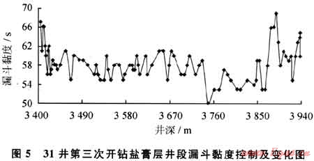 采取的具體措施包括:維持體系較低的堿性(即pH值一般保持在8~9);適當放大量以膠液形式補充各類處理劑進入體系以維護鉆進過程中材料的正常消耗;在井漿中不斷補充NaCl甚至到飽和以提高其整體抑制性;補充KCl至一定量以形成對黏土質(zhì)成分應(yīng)有的抑制效果等。圖5為31井第三次開鉆鹽膏層井段漏斗黏度控制及變化情況,由于加強了對鉆井液整體抑制性的維護,鉆井液流變性能明顯較好。