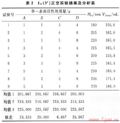 從表2可知,泡沫的攜液量都在150mL以上,其攜液能力(攜液能力=泡沫攜帶出的液體體積/總泡排劑溶液的體積×100%)[3]都在75%以上。因此,以起始泡高(0s)為考察指標(biāo)進(jìn)行分析,樣品L-2(D)是影響實(shí)驗(yàn)結(jié)果的最主要因素,單一表面活性劑L-1(A)。甜菜堿(B)和銨鹽(C)次之,最佳因素水平組合為A3B3C1D3。由于該配比不在原設(shè)計(jì)的試驗(yàn)方案中,為驗(yàn)證該配比的真實(shí)性,以該配比進(jìn)行起泡能力和攜液能力的測定,結(jié)果測得該配比的起始泡高度為265mm,攜液量為176.5mL。與表2中的8號(hào)試驗(yàn)結(jié)果相比,可證明該配比是9次試驗(yàn)中最優(yōu)的。因此通過正交設(shè)計(jì)實(shí)驗(yàn)確定泡排劑LYB-1的最佳質(zhì)量配比為L-1(A):甜菜堿(B):銨鹽(C):L-2(D)=5:3:3:8。
