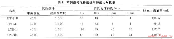為了充分說明泡排劑LYB-1具有較強(qiáng)的抗甲醇能力,30℃時(shí)將該泡排劑與現(xiàn)場應(yīng)用較多的泡排劑UT-118、HY-5G和HY-3G進(jìn)行了對(duì)比,試驗(yàn)結(jié)果見表3。表3數(shù)據(jù)表明,泡排劑LYB-1具有較強(qiáng)的抗甲醇能力,明顯優(yōu)于其他3種泡排劑。