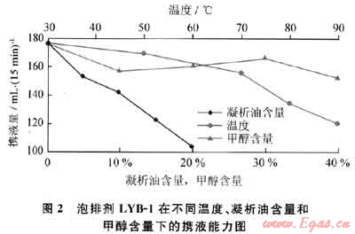 通常溫度升高,泡排劑溶液的黏度降低,泡沫易破裂,致使泡沫起泡能力和攜液能力變差。為了評(píng)價(jià)該泡排劑的耐溫能力,用地層水配制0.5%泡排劑溶液,測定了該泡排劑在不同溫度下的起泡能力和攜液能力(圖1)。