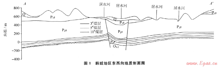 韓城地區(qū)隸屬于陜西省渭南市,地處關(guān)中平原的東北側(cè)。構(gòu)造上位于鄂爾多斯盆地渭北隆起的東南緣,東面以黃河和韓城大斷裂為界,南臨渭河地塹,西南與澄臺(tái)礦區(qū)毗鄰,面積約為1500km2。研究區(qū)構(gòu)造活動(dòng)平穩(wěn),區(qū)域上由南向北、由東向西逐漸變?nèi)?,一般邊淺部相對(duì)于中深部復(fù)雜。北部以擠壓構(gòu)造變形為主,呈北東南西向;南部主要為拉伸構(gòu)造變形,有2個(gè)主導(dǎo)方向,即北東南西向和東西向,總體構(gòu)造形態(tài)是一個(gè)傾向北西的具波狀起伏的緩斜大型單斜構(gòu)造(圖1)。韓城地區(qū)主力產(chǎn)氣煤層分別為山西組3t煤層和太原組5#、11#煤層。山西組為陸相沉積,主要為河流沖積 三角洲沉積體系;太原組為海陸交互相沉積,主要為海灣一漏湖沉積體系。煤系地層基底為石炭系本溪組的鋁土質(zhì)泥巖[1~4]。