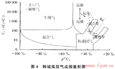 國(guó)內(nèi)外學(xué)者都提出了多種煤層氣成因類(lèi)型判別的圖版[16~17],多數(shù)是基于煤層氣組分和穩(wěn)定同位素的特征建立的,取得了較好的應(yīng)用效果。其中,Whiticar圖版是煤層氣成因判別的經(jīng)典圖版之一。為此,將韓城地區(qū)煤層氣的組成和同位素值數(shù)據(jù)在Whiticar判別圖版上成圖(圖4)。分析發(fā)現(xiàn)韓城煤層氣主要是熱成因氣,且存在經(jīng)過(guò)解吸一擴(kuò)散作用效應(yīng)改造過(guò)的次生煤層氣,這與從地質(zhì)條件推測(cè)碳同位素變輕的原因基本一致。再者,乙烷碳同位素值偏重也是熱成因氣的一個(gè)重要證據(jù),是生物氣不具有的。韓城地區(qū)煤層熱演化程度處于貧煤和無(wú)煙煤(Ro介于1.9%~2.6%)階段,結(jié)合煤層氣演化過(guò)程和氣體地球化學(xué)特征分析,筆者認(rèn)為韓城煤層氣的成因類(lèi)型以熱降解氣為主且系經(jīng)過(guò)解吸-擴(kuò)散效應(yīng)改造的次生熱成因氣。因此,應(yīng)以尋找熱成因氣為今后的煤層氣主要勘探目標(biāo)。