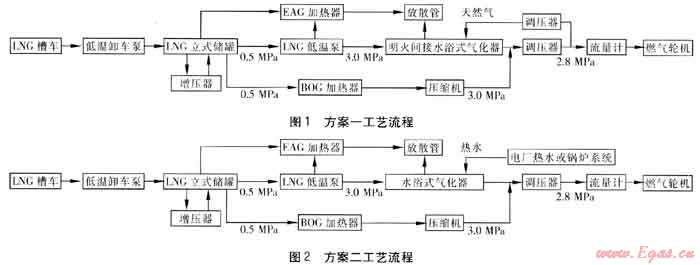 方案二比方案一節(jié)省造價1088.6×104元。方案一選用的明火間接水浴式氣化器為美國進(jìn)口設(shè)備,價格較高,同時方案一還需增加氣化器所用燃?xì)獾恼{(diào)壓設(shè)備。方案二所用的水浴式氣化器利用了電廠現(xiàn)有的熱水系統(tǒng),造價更為節(jié)省。