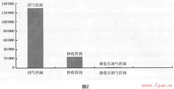 (2) 咨詢類:2010年服務(wù)督察處共受理各類咨詢共154758起(其中藍(lán)焰熱線共受理咨詢類電話153623起,受理外網(wǎng)咨詢1135起),同比增長25%,2009年全年受理咨詢?yōu)?23813起。2010年從整個(gè)咨詢的內(nèi)容來看,主要在以下幾個(gè)方面:用氣知識(shí)類咨詢有129403起,如IC卡使用相關(guān)技術(shù)咨詢;燃?xì)饨毁M(fèi)網(wǎng)點(diǎn)和交費(fèi)方式的咨詢;報(bào)修上門的具體時(shí)間咨詢等,共占總體咨詢的84%;抄收類咨詢有24 024起,如咨詢抄表時(shí)間、抄表員電話及查詢客戶號;咨詢?nèi)細(xì)馐召M(fèi);咨詢停送氣具體時(shí)間等,占總體咨詢的15%;液化石油氣類咨詢共1331起,占總體咨詢的1%。如圖2所示。