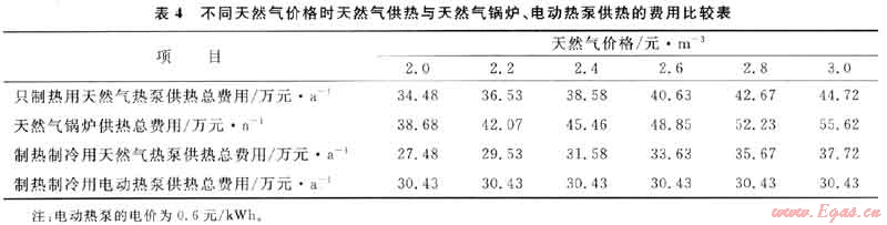 電動(dòng)熱泵與天然氣熱泵均能用于夏天制冷、冬天制熱。但天然氣熱泵能利用一部分發(fā)動(dòng)機(jī)的余熱,實(shí)際上天然氣熱泵供熱量比電動(dòng)熱泵少,冷凝器和蒸發(fā)器的換熱面積少,二者的設(shè)備費(fèi)用相差不大。因此,天然氣熱泵與電動(dòng)熱泵供熱費(fèi)用的比較主要取決于天然氣和電的相對(duì)價(jià)格。在供熱量相同的前提下,電價(jià)為0.6元/kWh時(shí)的電動(dòng)熱泵供熱費(fèi)用與不同天然氣價(jià)格時(shí)天然氣熱泵供熱費(fèi)用的比較見表4。由表可知,天然氣價(jià)格為2.2元/m3時(shí),天然氣熱泵的供熱費(fèi)用與電價(jià)為0.6/kWh時(shí)的電動(dòng)熱泵供熱費(fèi)用相當(dāng);如果天然氣熱泵只在冬天用于供熱,夏天不用于制冷,由于設(shè)備費(fèi)用不分?jǐn)偅还釙r(shí)的非燃料費(fèi)用增加,則供熱總費(fèi)用增加。