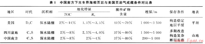 1) 中國南方海相頁巖沉積時代比美國老,主要以早古生代寒武紀和志留紀為主。日前美國頁巖氣開發(fā)的5個主要盆地中,頁巖的形成時代以晚古生代泥盆紀、密西西比紀和中生代白堊紀為主。