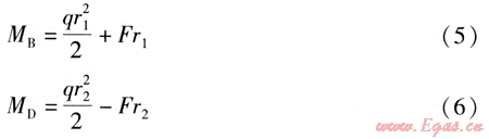 設r2≥r1,則活動支架B、D處管道截面彎矩MB、MD的計算式分別為: