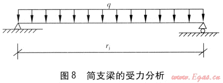 在架空敷設的供熱管道中,z形架空敷設的形式也較多見。對于z形架空敷設供熱管道,我們考慮兩種敷設形式:一種是短邊無活動支架的敷設形式,見圖6;另一種是短邊有活動支架的敷設形式,見圖7。在活動支架距兩個轉(zhuǎn)角較近的情況下(見圖6、7),這兩個活動支架上的管段受力可視為簡支梁受力,受力分析見圖8。