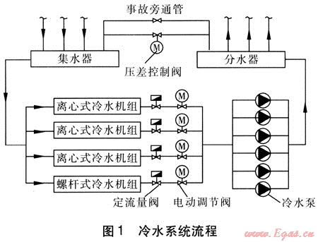對(duì)于大型空調(diào)系統(tǒng),為使空調(diào)系統(tǒng)在低負(fù)荷運(yùn)行時(shí)也有較高的效率,設(shè)計(jì)人員多采用大容量離心式冷水機(jī)組與小容量螺桿式冷水機(jī)組進(jìn)行組合。當(dāng)負(fù)荷較小時(shí),運(yùn)行螺桿式機(jī)組即可。在進(jìn)行螺桿式機(jī)組選型時(shí),可按照離心式機(jī)組制冷能力的40%進(jìn)行選擇[6]。該空調(diào)系統(tǒng)選用3臺(tái)離心式機(jī)組與1臺(tái)螺桿式機(jī)組,冷水進(jìn)、出水溫度為13、7℃,冷卻水進(jìn)、出水溫為32、37℃。冷水機(jī)組與附屬設(shè)備見(jiàn)表1[7],冷水系統(tǒng)流程見(jiàn)圖1。