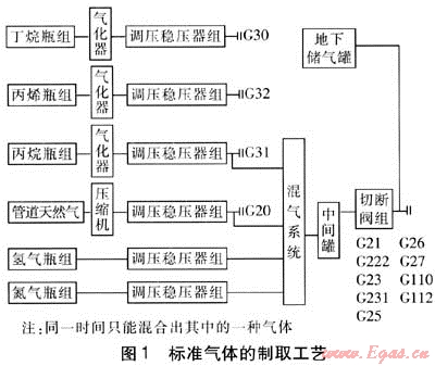 圖1中,G30、G32和G31這3種標準氣體分別經(jīng)氣化器和調(diào)壓穩(wěn)壓器組氣化、調(diào)壓穩(wěn)壓后,作為標準氣體直接使用;G20是由管道天然氣升壓、調(diào)壓穩(wěn)壓后作為標準氣體直接使用;其余9種標準氣體由氫氣、氮氣、管道天然氣和丙烷4種基礎(chǔ)氣源按比例在混合器中混合而成,其中的氫氣、氮氣經(jīng)調(diào)壓后使用。