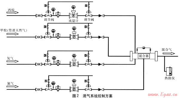 對于上述標準氣體,除組成外,更關(guān)心的是熱值,故在混合器出口設(shè)置熱值儀來檢測制取的標準氣體的熱值[5]。同時將檢測到的熱值反饋至控制系統(tǒng),對混氣比例進行微調(diào),使整個控制系統(tǒng)成為閉環(huán)系統(tǒng)。