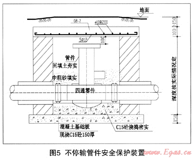 (1) 為確保管網(wǎng)安全運行,對無法滿足規(guī)范要求埋深的管道、管件按圖5所示增加安全保護裝置。該保護裝置適用于機動車道、非機動車道及其他路段的不停輸作業(yè)施工。施工時基地要密實且避免雨天施工,混凝土基礎(chǔ)板與管底間必須用素混凝土澆搗密實;蓋板為預(yù)制可移動且上方預(yù)留探孔,方便今后日常維護。在開挖條件許可的情況下,可采用四通管件底部開孔預(yù)制連接施工法滿足規(guī)范埋深要求。