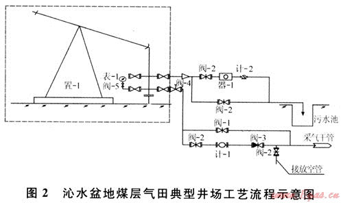 采用套管采氣、油管采水的井場(chǎng)工藝。井口由抽油機(jī)將地層水采出,通過消氣器將水中攜帶的氣體分離,經(jīng)水表計(jì)量后排至井場(chǎng)污水池中。煤層氣從煤層中解吸后由套管采出,通過井場(chǎng)智能旋進(jìn)流量計(jì)計(jì)量后,經(jīng)采氣管線輸送至集氣站。井場(chǎng)設(shè)置放空火炬及排采放空接口,在排采及事故時(shí)將煤層氣放空焚燒。井場(chǎng)工藝流程圖見圖2所示。