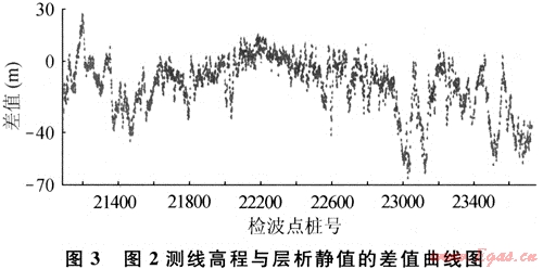 圖3是圖2測線高程與層析靜值的差值曲線。該曲線是對近地表結(jié)構(gòu)的非均質(zhì)性測量,反映出近地表結(jié)構(gòu)對地震波場的影響??梢钥吹剑擄L化類型的靜值周期有長有短,長周期將影響構(gòu)造形態(tài),短波長將影響地震成像質(zhì)量。