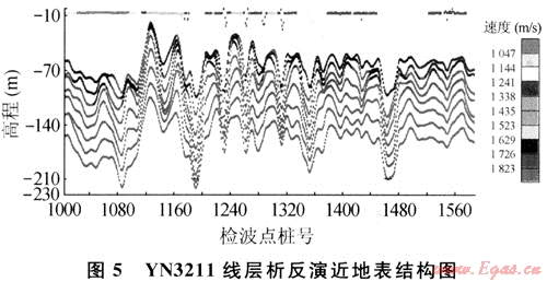 在利用初至波層析反演方法中,最大炮檢距可控制層析測量深度。通過調(diào)節(jié)最大炮檢距可獲得反演測線近地表結(jié)構(gòu)的底界面。在該界面上速度橫向變化比較小、層厚度橫向變化也比較小。這可以說明,在該炮檢距下層析所測近地表結(jié)構(gòu)已經(jīng)接觸到了其下的高速巖層,而且,該界面以下地層對靜校正量已沒有影響、或影響很小。圖2即是用這種方法所獲得的近地表結(jié)構(gòu)。實踐表明,同一地區(qū)二維測線層析反演時,用同一最大炮檢距所計算的靜校正量,各測線是相互閉合的。