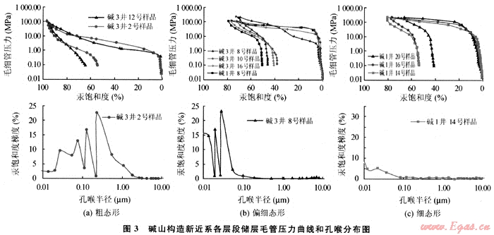 表2 堿山構(gòu)造新近系天然氣儲(chǔ)集層孔隙結(jié)構(gòu)特征參數(shù)表
