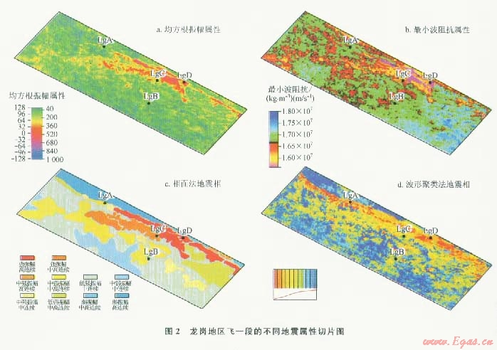 地震相識別技術采用了相面法定性分析和波形聚類半定量分析,利用這兩種地震相識別技術對飛仙關組鮞粒灘體進行預測,認為用相面法來劃分地震相能粗框架的限定鮞粒灘體的發(fā)育部位(圖2-c),再有針對性地對灘體發(fā)育部位利用波形聚類法進行地震相劃分(圖2-d)能更精細地識別灘體。